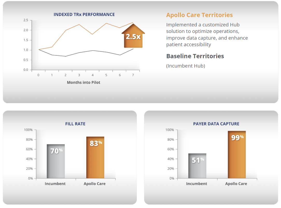 To address these challenges, Apollo Care implemented a pilot program combining its Hub services with advanced copay solutions across approximately half of the U.S. market.